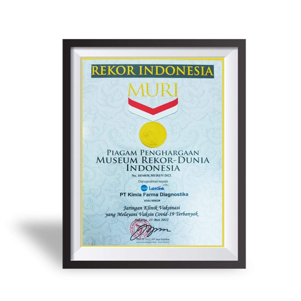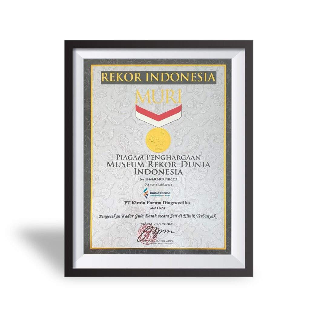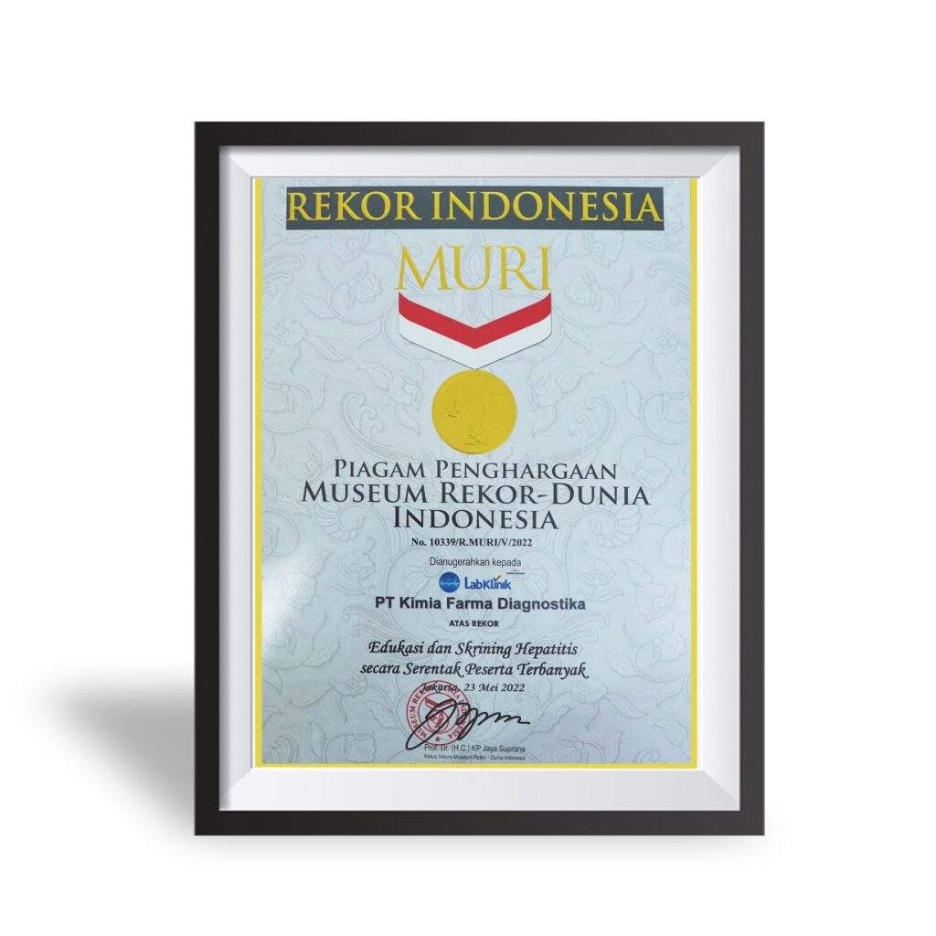 Penghargaan Muri Edukasi dan Skrining Hepatitis Secara Serentak Tahun : 2022 Muri Jaringan Klinik Vaksinasi yang Melayani Tahun : 2022 Muri Pengecekan Kadar Gula Darah secara Seri Tahun : 2023 Wow Brand Gold Champion “Category Clinical Laboratory” Tahun : 2021 Wow Brand Gold Champion “Category Clinical Laboratory” Tahun : 2022 Muri Edukasi dan Skrining Hepatitis Secara Serentak Tahun : 2023 “Penta Helix” Program Pengabdian da Pemberdaya Tahun : 2023 Prestasi dan Komitmen Menggerakkan Program Pem Tahun : 2023