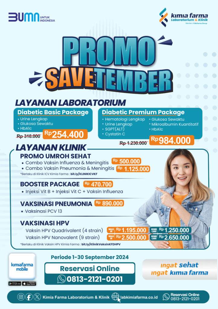 Dengan Promo SAVEtember, bukan hanya uang yang kamu hemat, tapi juga waktu dan tenaga. Dapatkan layanan kesehatan terbaik dengan mudah, dan jadikan kesehatan prioritas utama tanpa stres. Layanan Kimia Farma Laboratorium & Klinik tersedia untuk memastikan kesehatanmu dan keluarga selalu dalam kondisi terbaik. 🌟👨👩👧👦